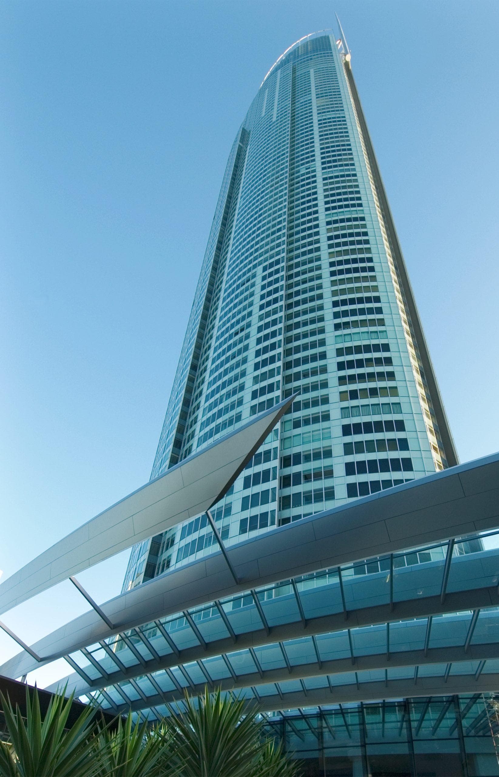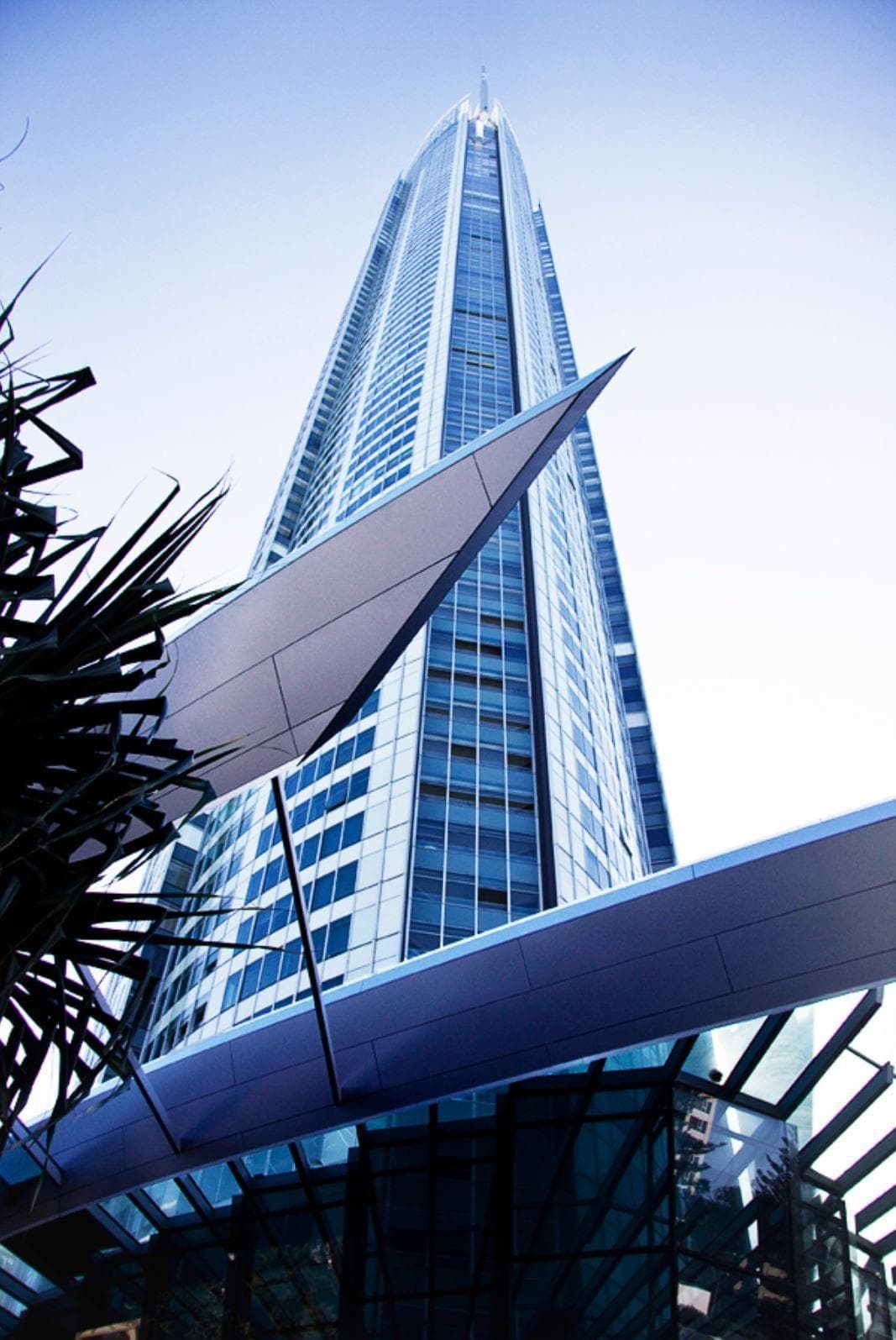 Designed by The Buchan Group and Sunland Group in the year of the 2000 Sydney Olympics, Q1’s form draws inspiration from the Olympic torch and the Sydney Opera House. The building’s sculptural glass facade reflects these iconic designs, while the sweeping roof and spire pay tribute to the torch, creating a striking presence on the skyline.