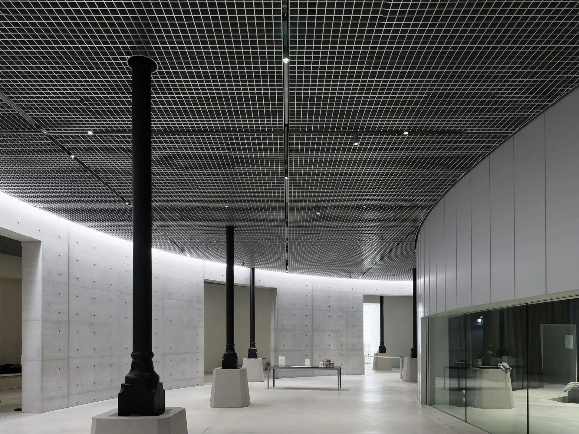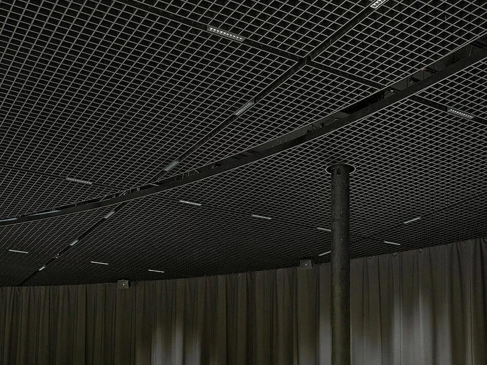 The round structural concept is supported by the durlum GEO open-cell ceiling. This open ceiling in plain anodised and black extends into the foyer and the auditorium, communicating an elegant yet mysterious impression. In a refined manner, the 780m² of open-cell ceiling underscore the prestigious atmosphere of this building without in any way detracting from the visual impact of the exhibits. With sleek, concealed suspension, these elements were integrated into predefined modules consisting of lighting channels.