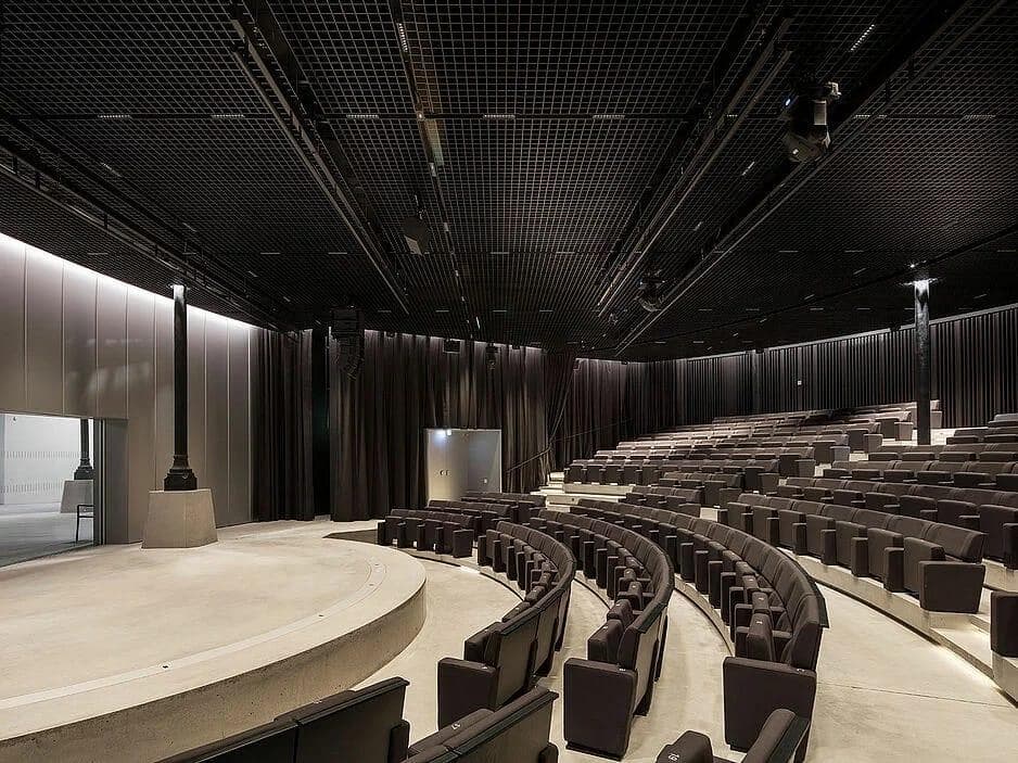 GEO 9H80 DOUBLE BLADE LOUVRE with U94 carrier; material: 0.4mm aluminium; cell dimensions: 80 x 80mm; web width: 9mm; web height: 80mm; square and rectangular panel formats: 800 x 800mm and special sizes; colour: graphite black like RAL 9011 in the auditorium, plain-anodized mill-finish in the foyer [approx. 780m²