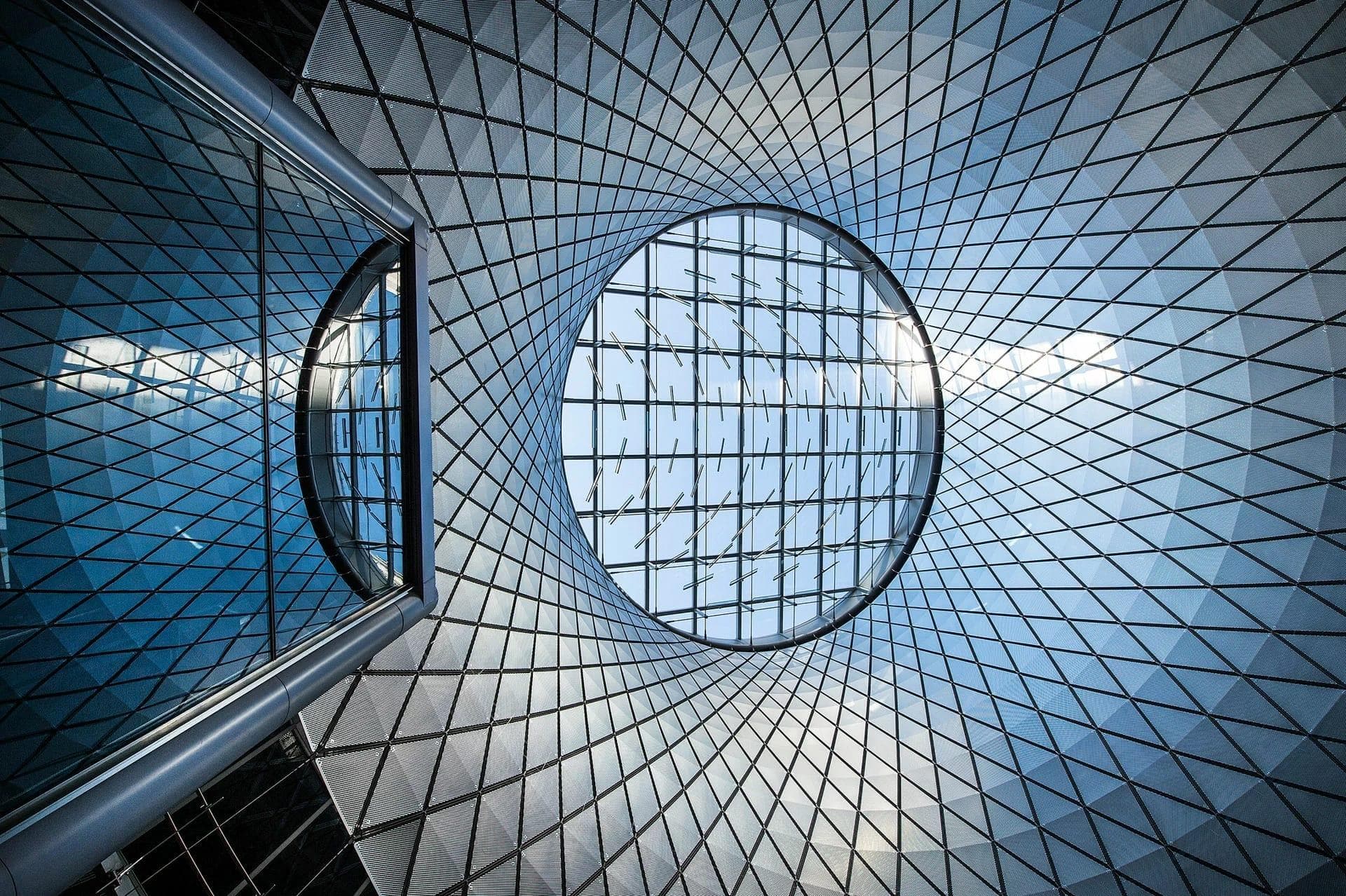 Sky Reflector Net system featuring 952 individually designed, three-dimensional aluminium daylight reflecting panels, suspended on steel cables and engineered to reflect up to 95% of natural light.
