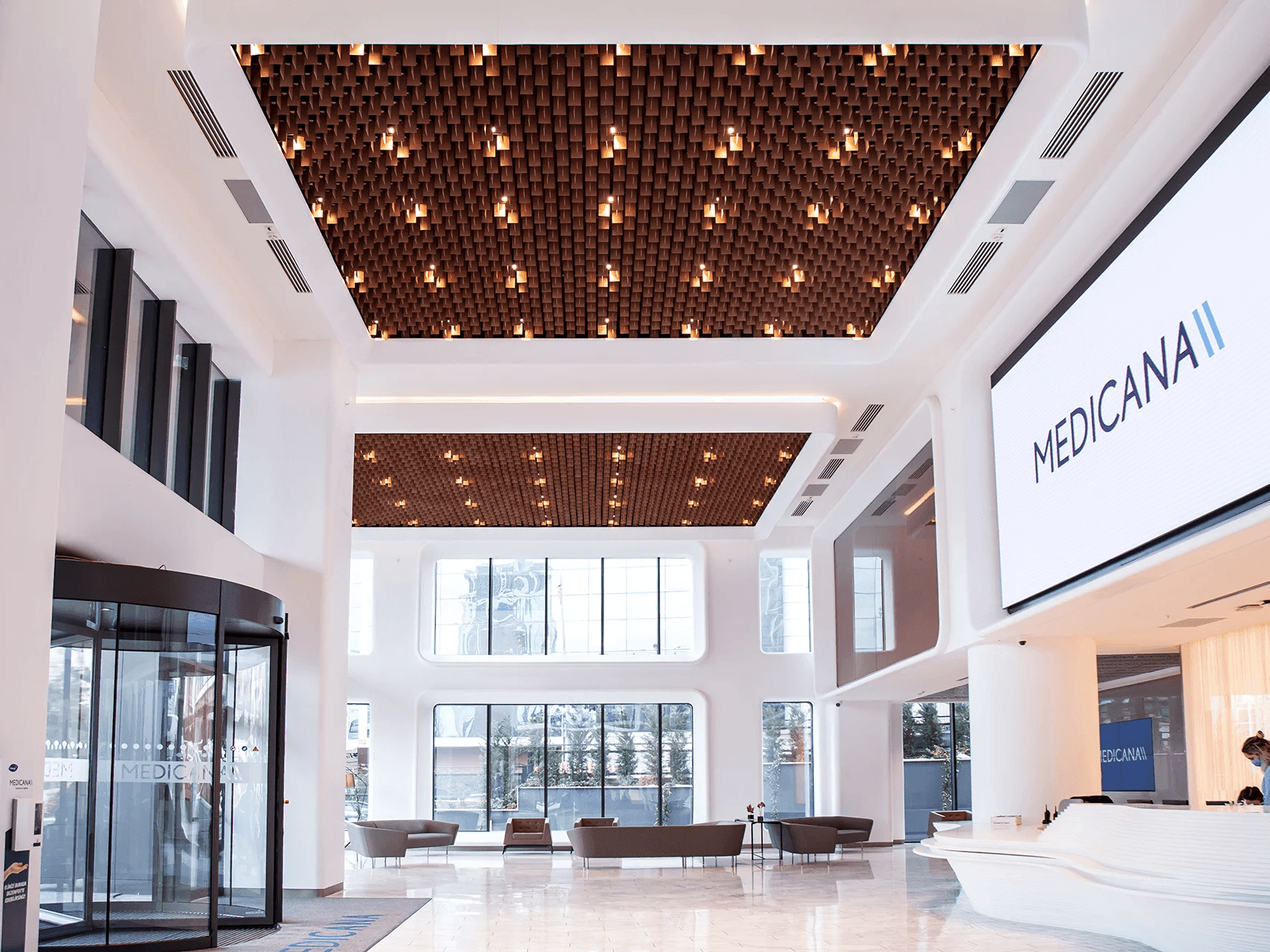 From the lobby to the rooms for patients and doctors, the premises are designed to promote the healing process and make a pleasant stay in hospital possible. Fitting perfectly into the overall concept are the stunning LIVA and LOOP metal ceilings by durlum. A sight to behold, the bronze coloured LIVA ceiling adorns the entrance and waiting area. With its baffles arranged multi-directionally, and with a free cross-section of more than 95%, it creates an open and homogeneous ceiling look. To completely conceal the ceiling void from onlookers, the LIVA ceiling was custom designed to be installed below the plasterboard ceiling. In other areas, the acoustically optimised LOOP metal ceiling with PUNTEO-J60 LED spots provides an elegant, seamless look and an atmosphere that promotes a sense of wellbeing. The vision, design and function have been adapted perfectly to suit the needs of patients and has helped to create a trailblazing hospital that will play an important role in Turkey.