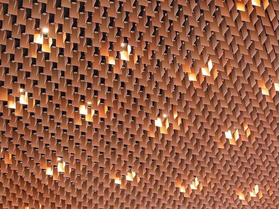 Multidirectional LIVA open-cell ceiling: Designed in two different dimensions: Dimensions [HxW]: 200x98 mm and 100x98 mm; spacing: 120mm; powder-coated in bronze; surface area. LOOP TYPE 2: Aluminium; free cross-section >50%; deep-drawn perforation with a diameter of 60mm; acoustically effective design with DUROBOND; powder-coated in metallic; surface area. PUNTEO-J60: Efficient LED downlight with superlative glare suppression; pieces.