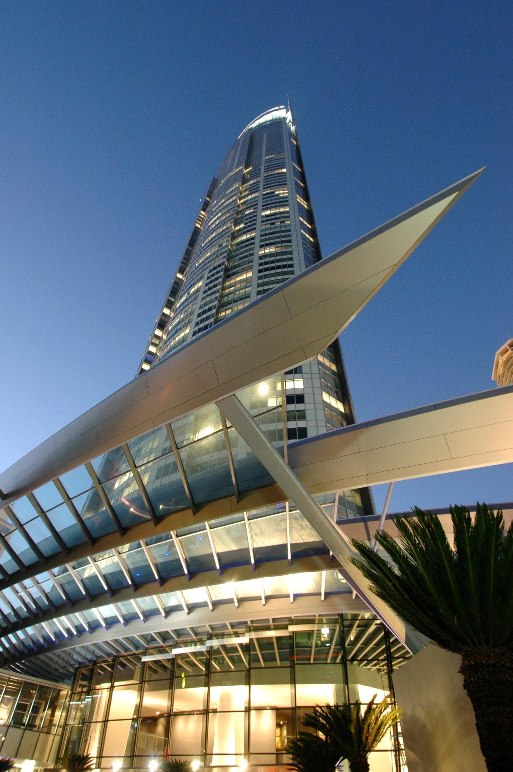 Designed by The Buchan Group and Sunland Group in the year of the 2000 Sydney Olympics, Q1’s form draws inspiration from the Olympic torch and the Sydney Opera House. The building’s sculptural glass facade reflects these iconic designs, while the sweeping roof and spire pay tribute to the torch, creating a striking presence on the skyline.